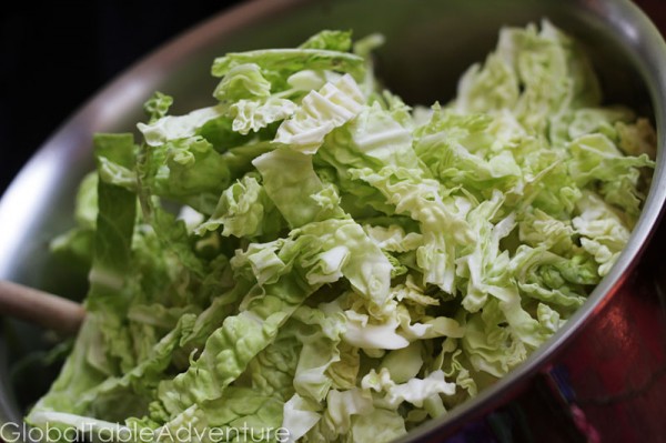 - Add the chopped cabbage. Stir and cook until wilted