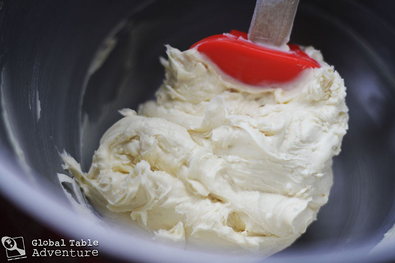 Cream the ghee and powdered sugar together. Ghee is available at the supermarket, usually near the regular butter.