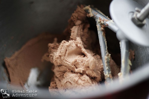 Once beaten in, the cocoa turns the dough light brown and adds delicate dark cocoa flavor. To me, it looks like chocolate ice cream. Yum.