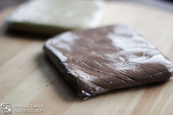 Place each dough in saran wrap and pat into square discs. Refrigerate for 30 minutes before shaping.