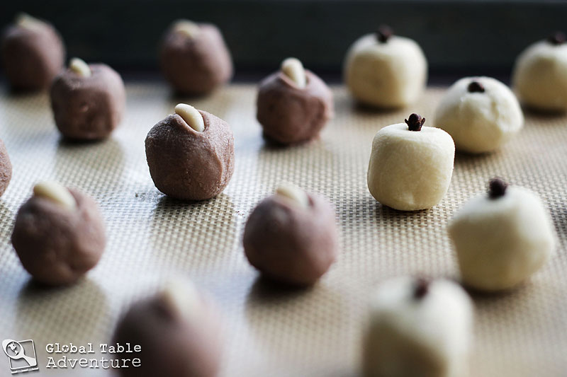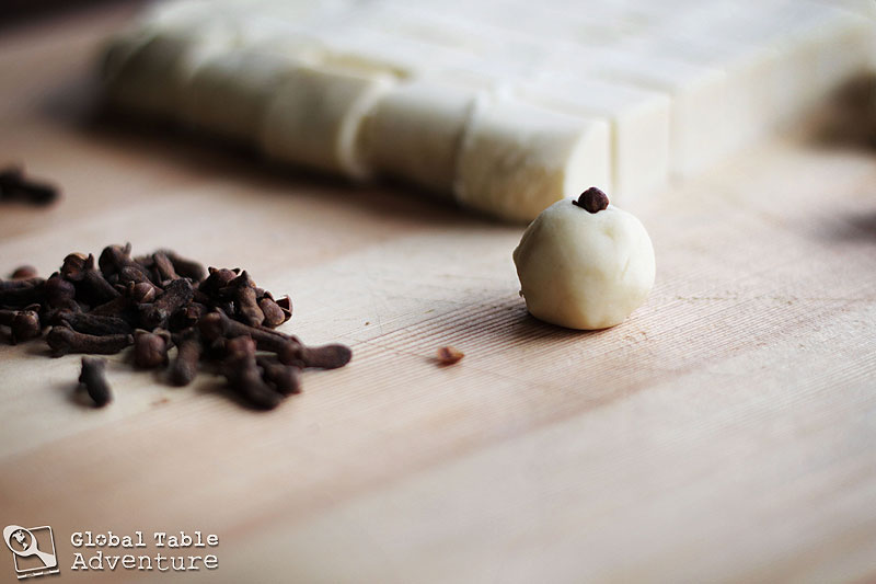 Working with one disc at a time, slice into even squares. Then roll each square in your hand until a ball forms. Press a clove or a pine nut into the center.
