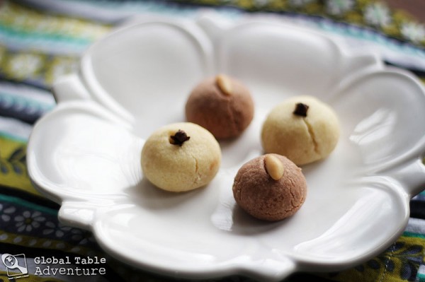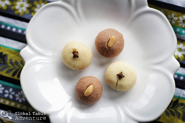 I made half of the cookies plain and half of them with a hit of cocoa. Decorated with whole cloves (yes, eat the whole thing!) and pine nuts, they make for a delightful giftbox for a hostess gift. The funny thing about these cookies is that they do not spread. At all. And they cook very quickly, so plan accordingly