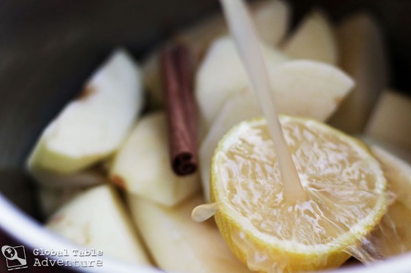 - Place in a medium pot with the apple juice, lemon and cinnamon sticks.